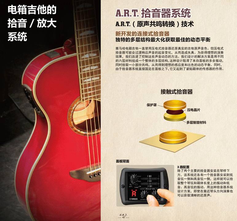 S.R.T.系统可以将录音棚级的原声吉他音色转移到舞台上。最终为您的观众带来愉悦和享受。