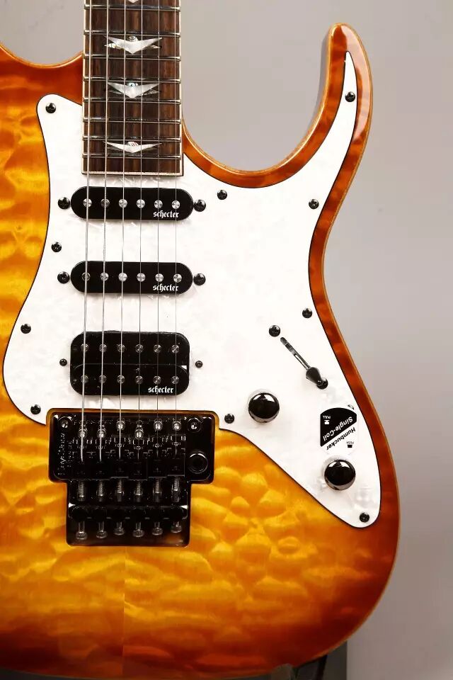 Schecter Diamond Plus/Single Coil搭配的单单双拾音器组使得这款琴能适合更多风格的音乐,Schecter Diamond Plus是一个能切单的双线圈拾音器,为使用者的音色提供更多的选择,琴面带有枫木贴面,搭配精美的渐变亮漆,非常漂亮。总的来说这款琴的外观和可用性都很好,特别适合喜欢高颜值和高性价比的人。