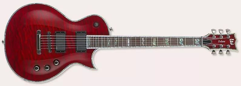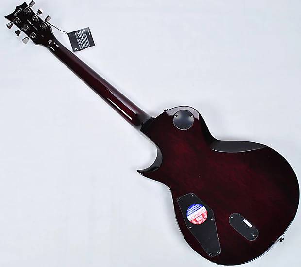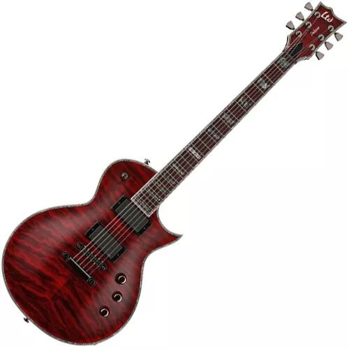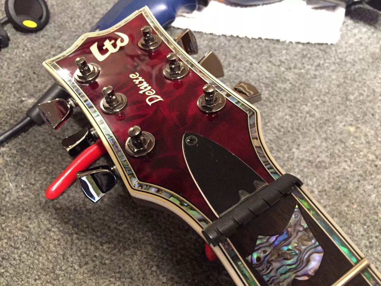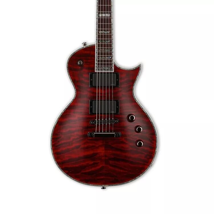 而这支LTD EC1000 STBC则是LTD韩产里的最高“1000”系列,豪华的贝壳包边覆盖了整 一把琴的边缘部位,甚至连指板和琴头也有华丽的贝壳,品记也不是常规的原点式而是换成了旗状贝壳镶嵌。第一眼看上去就是闪亮的贝壳,非常豪华。而琴体则采用了拱面枫木贴面,很是绚丽夺目。