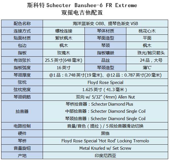 现货供应的平价Banshee Extreme系列有着平面琴体的造型和单单双的拾音器配置。Schecter近几年推出的Banshee系列与多年沿袭的众多拱面(arched top)C型琴体吉他有着很大不同,也极大地丰富了Schecter双缺角(double-cutaway)吉他的产品线,在设计方面可谓向美产、日产Schecter看齐——有着华丽的絮状枫木贴面与珠光白护板。